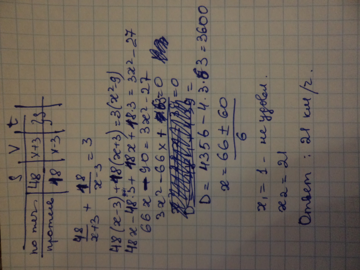 x₁=21 x₂=1 x₂∉,так как скоростьлодки должна быть больше скорости течения реки.