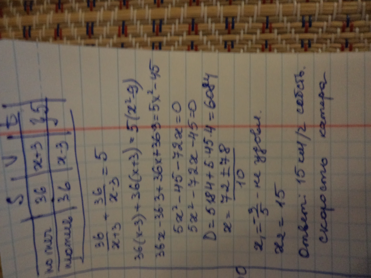 відстань між двома пристанями по річці дорівнює 36км. катер шлях туди й назад подолав за 5год. знайдіть власну швидкість катера, якщо швидкість течії дорівнює 3км/год?)