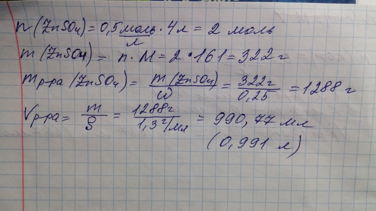 Рассчитайте объём раствора сульфата цинка (w=25%, ρ=1,3г/мл), который необходимо разбавить водой для получения 0,5М раствора этой соли объёмом 4л.