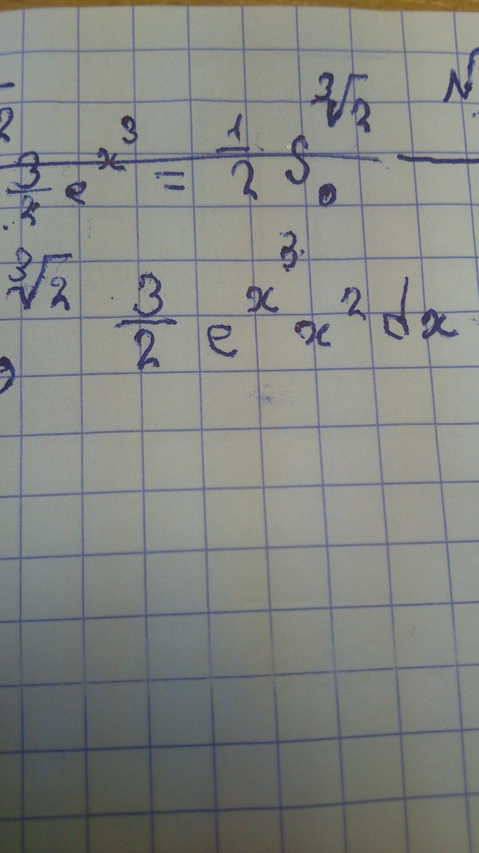 Дело вот в чём: Загоняй x^2 под d, будет (dx^3)/3. Получил примитивный интеграл от e(x3)dx^3, он равен e(x^3) и перед интегралом остался множитель 1/2. В итоге получится (e(x^3))/2. Ну а дальше подставляй пределы, которые ты не указал в задании.
