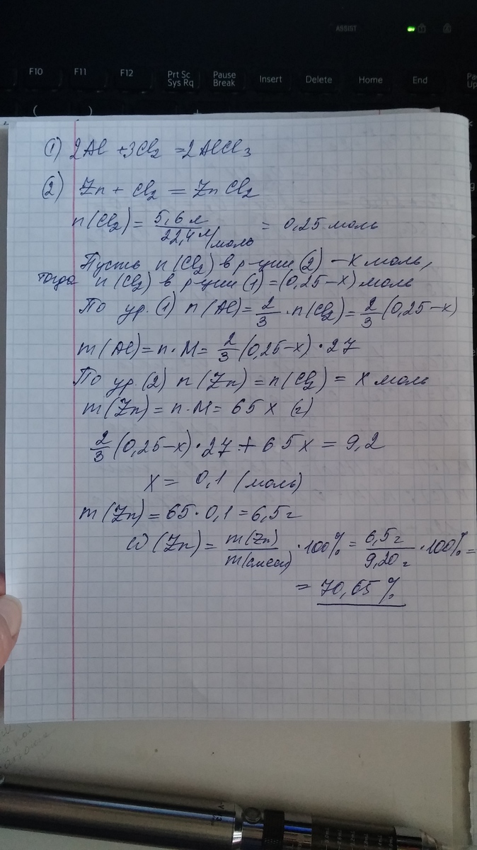 На хлорирование 9,20 г смеси алюминия и цинка расходуется 5,60 л (н.у) хлора.
