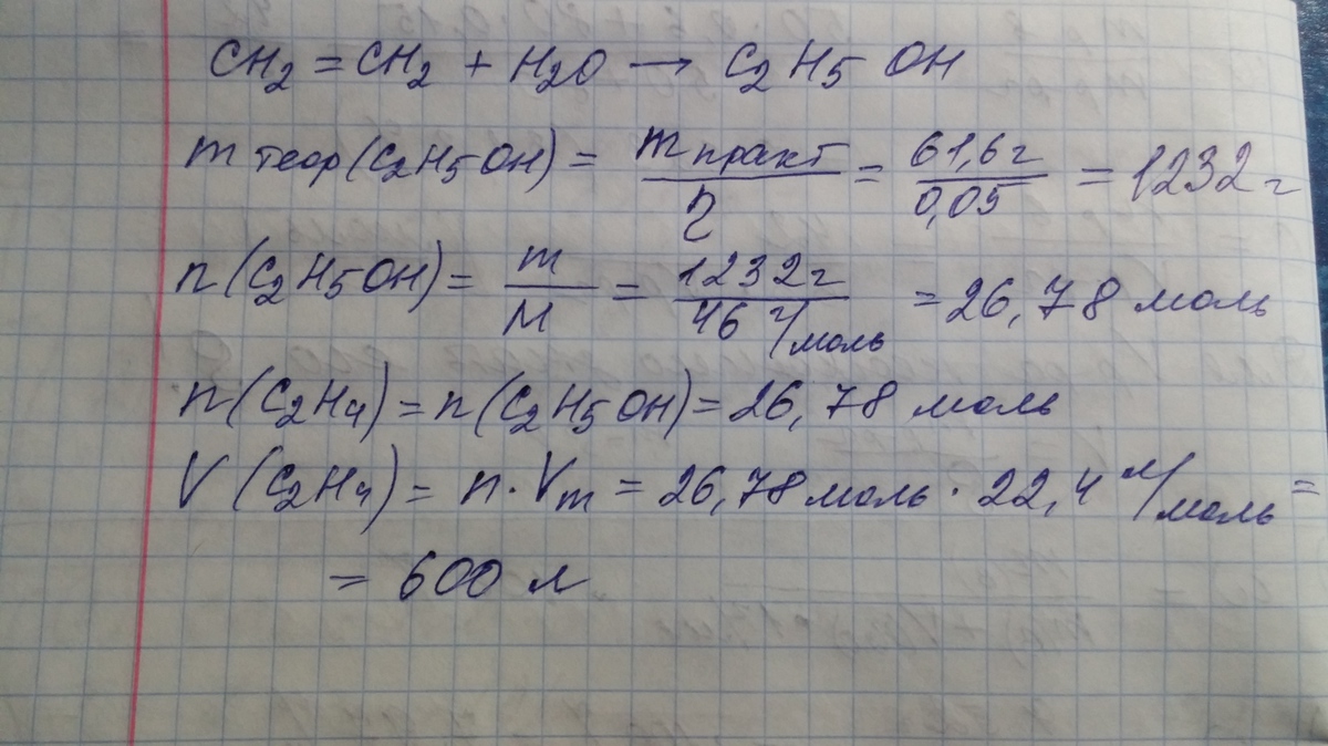 Сколько литров этилена необходимо взять для получения 61,6 г этанола ,если выход продукта реакции составляет 5% от теоретического ?