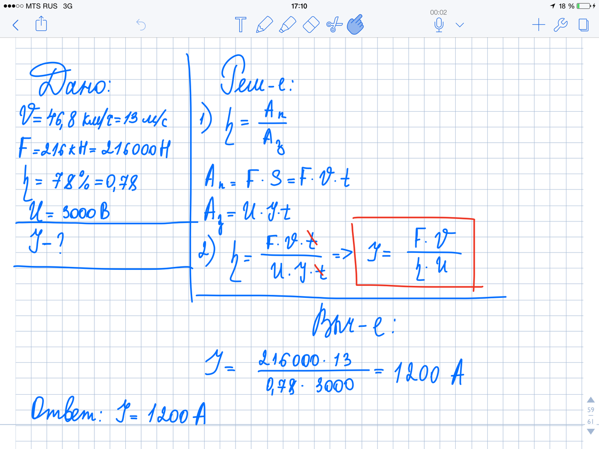Электровоз движется с постоянной скоростью 46,8 км/ч, развивая при этой скорости силу тяги 216 кН. КПД двигателя электровоза 78 %. Чему равна сила тока в обмотке электродвигателя, если напряжение сети 3000 В?