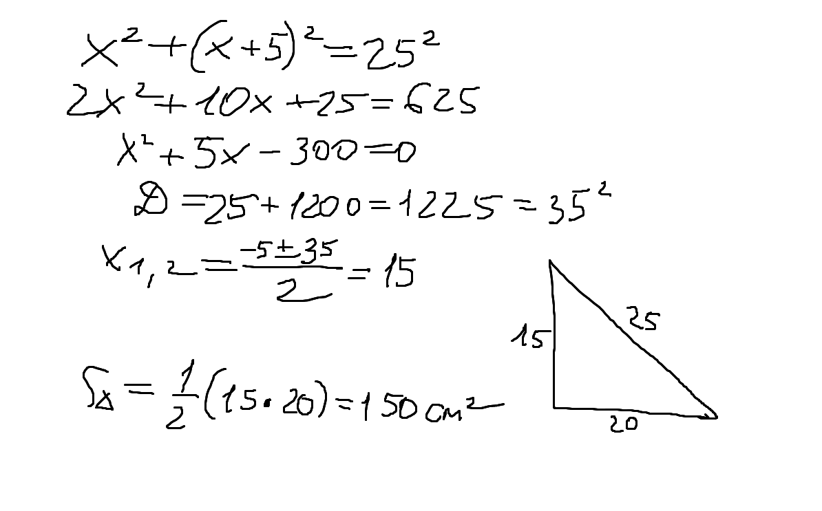 1. Найти площадь прямоугольного треугольника, если известно, что один из его катетов на 5 см больше другого, а гипотенуза равна 25 см.