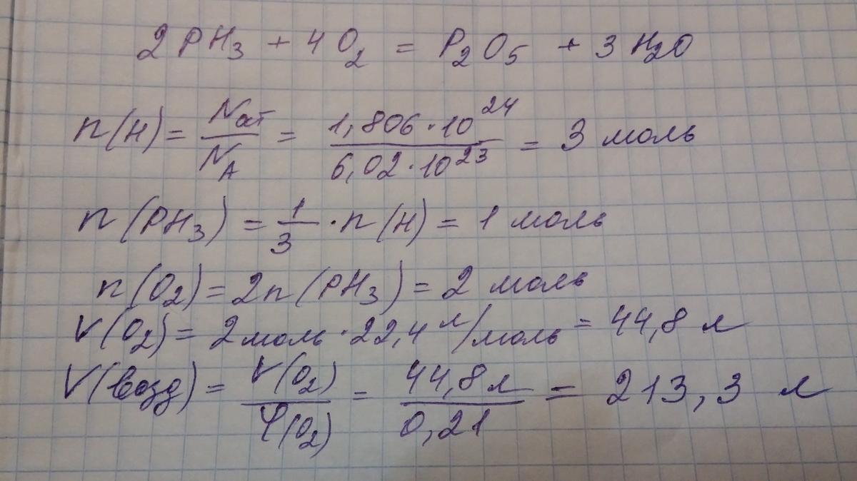 Вычислите объем воздуха,который необходимо затратить (н.у.) на сгорание порции летучего водородного соединения фосфора, содержащего 1,806*10^24 атомов водорода.