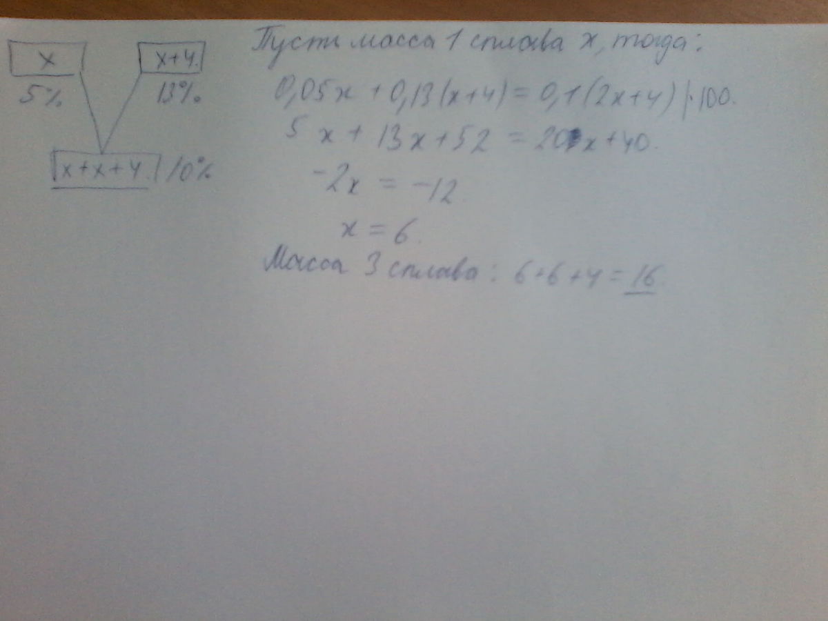 Первый сплав содержит 5% меди, второй - 13% меди. Масса второго сплава больше массы первого на 4 кг. Из этих двух сплавов получили третий сплав, содержащий 10% меди. Найдите массу третьего сплава