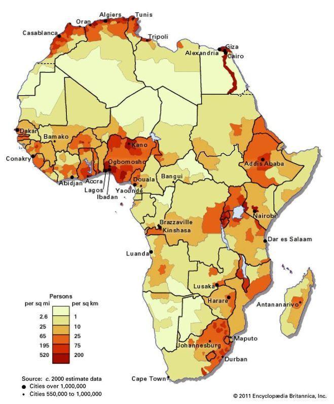 населены особо плотно береговые части, в особенности ближе к европе.: алжир, ливия, египет... на юге ЮАР.
