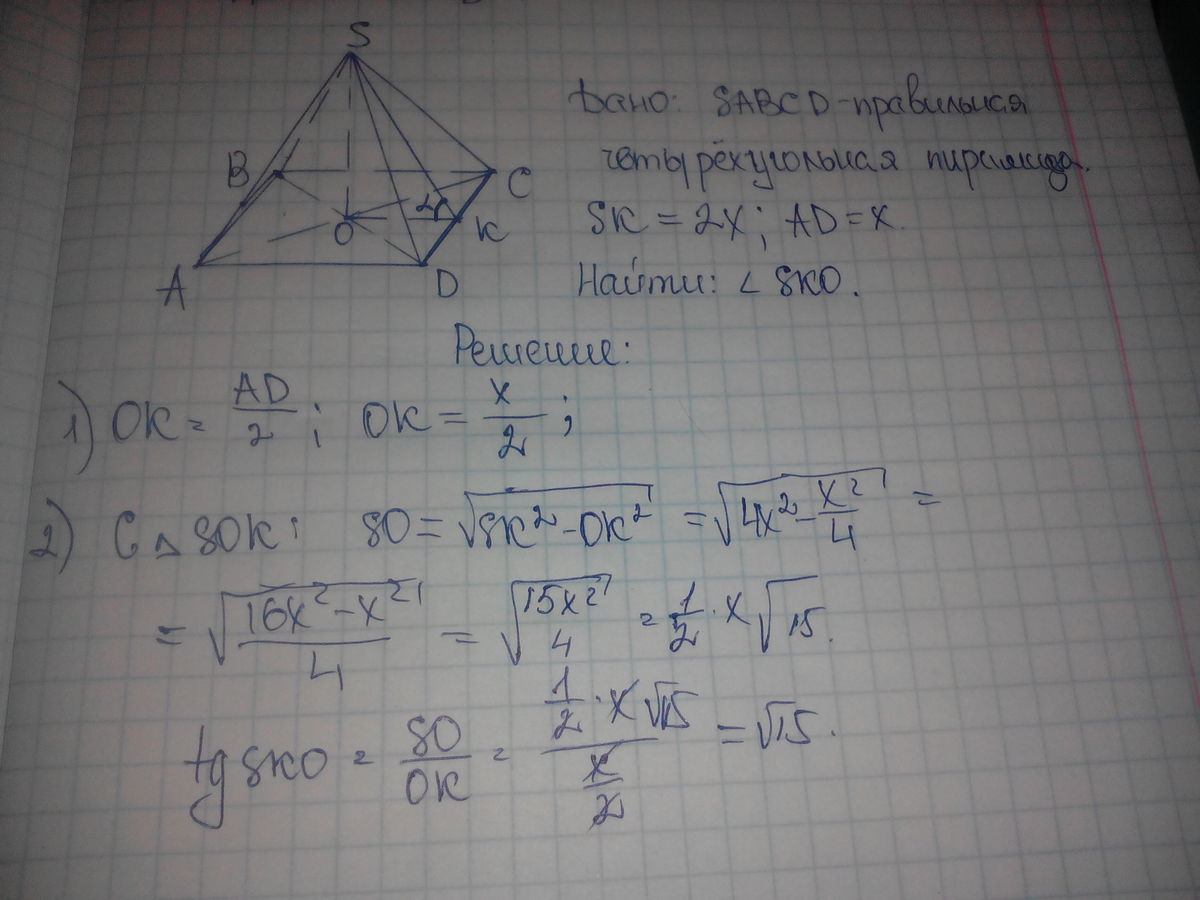 Апофема правильной четырехугольной пирамиды вдвое больше стороны основания. Найдите тангенс угла между плоскостями боковой грани и основания пирамиды