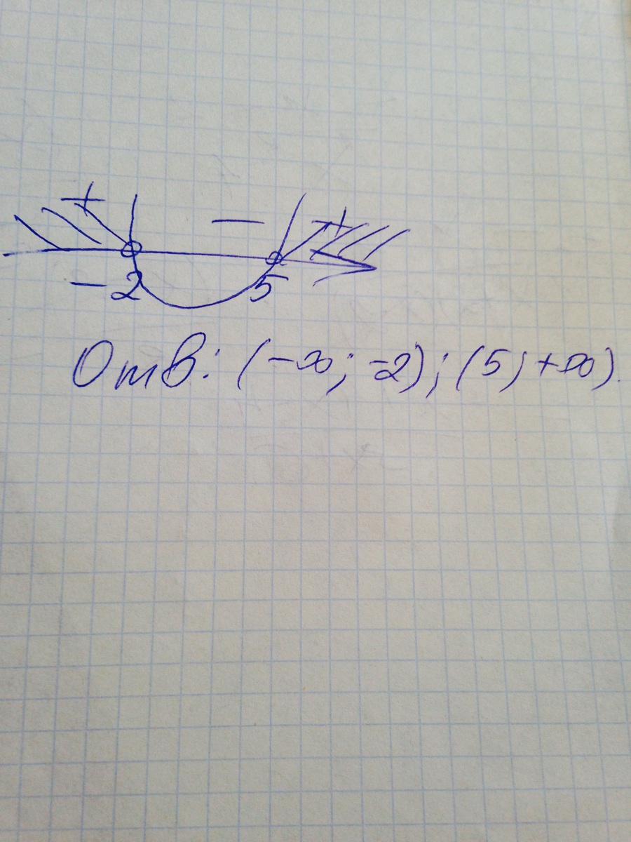 Ответ: (-бесконечность;-2) U (5; +бесконечность)
