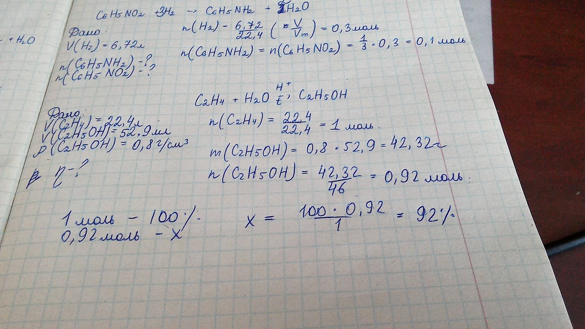 Из 22,4 л (н.у.) этилена получено 52,9 мл этанола ( плотность 0,8г/см3). Практический выход ( в процентах) составляет...
