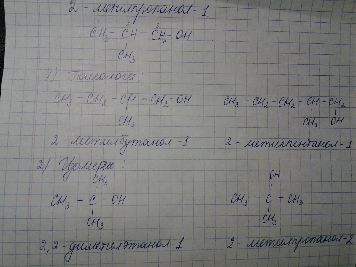 для вещества 2-метилпропанол - 1 напишите структурную формулу и составьте 2 гомолога и 2 изомера.