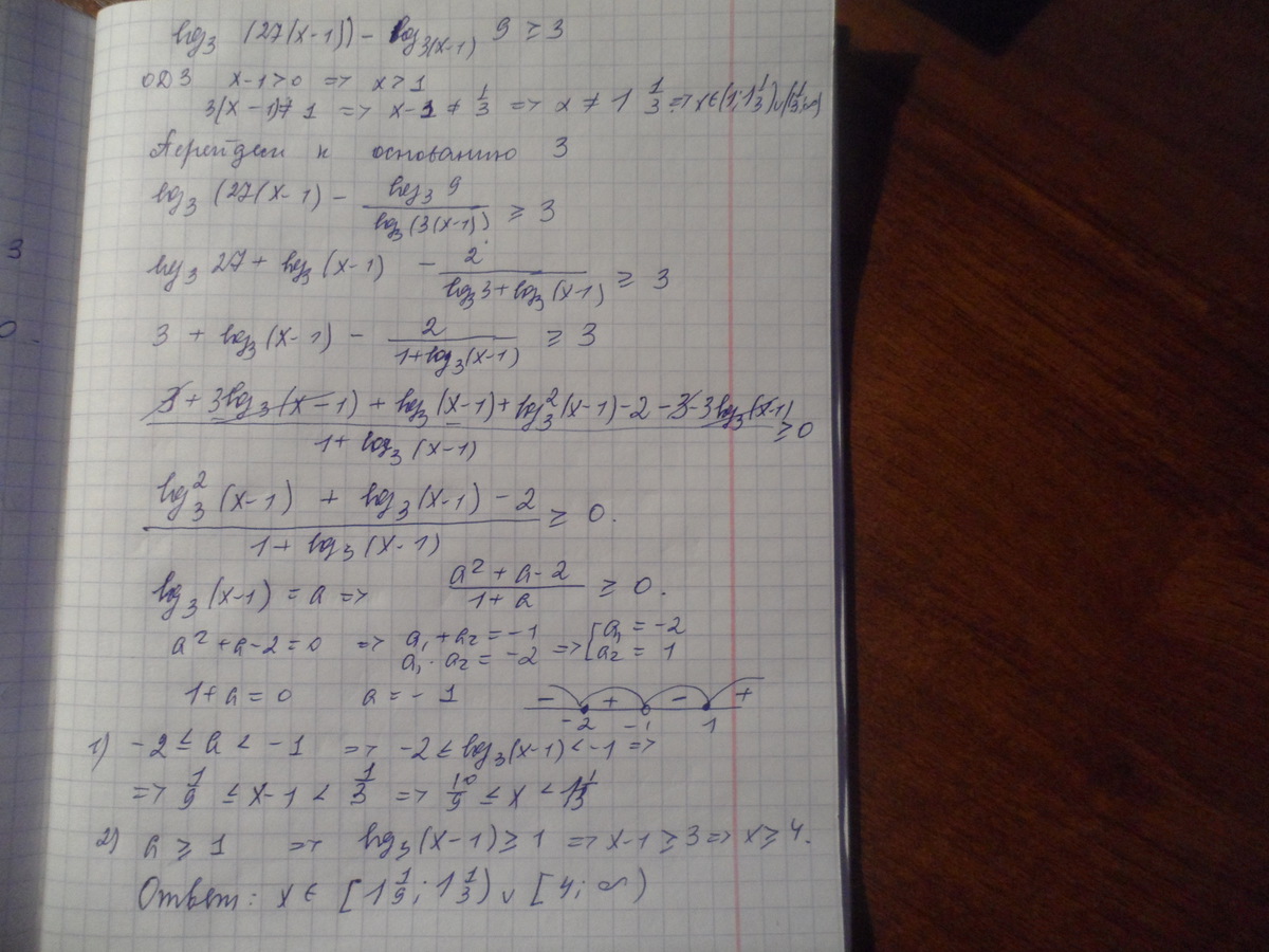 log (27(x-1)) по основанию 3 - log 9 по основанию 3(x-1) больше либо равно 3