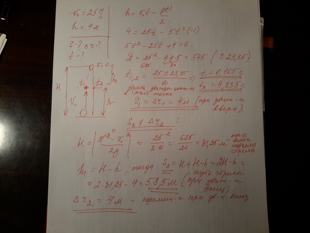 скоростью v0=25 м/с, окажется на высоте h=4 м? Какой путь S пролетит стрела? Чему равно ее