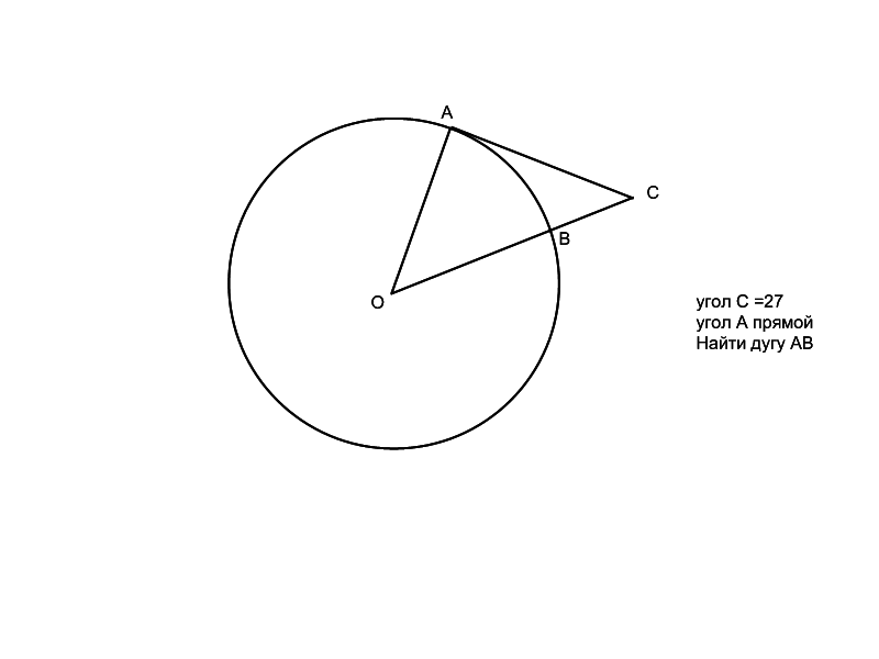 <AOB=180-90-27=63 ⇒ (дуга)AB=<AOB=63