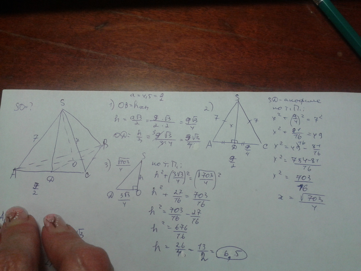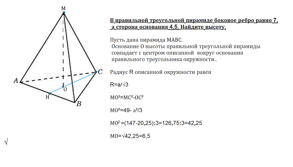 В правильной треугольной пирамиде боковое ребро равно 7, а сторона основания 4,5. Найдите высоту.