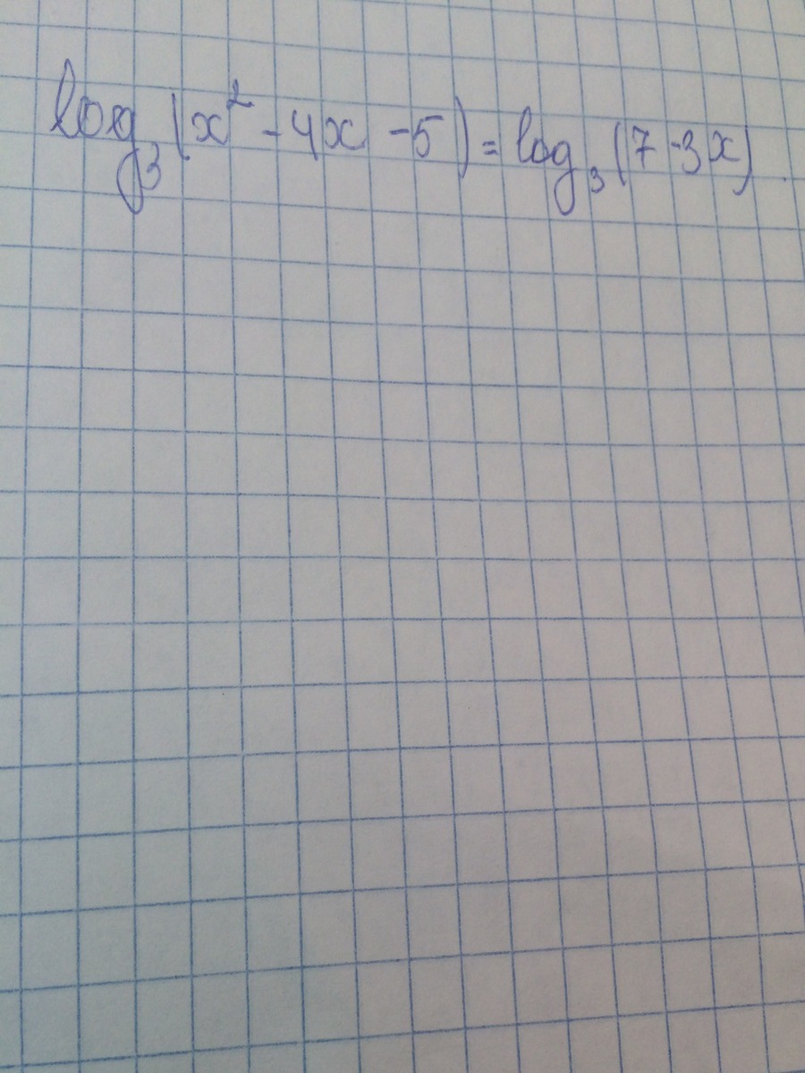 log_3(x^2-4x-5)=log_3(7-3x)\; ,\\\\ODZ:\;  \left \{ {{x^2-4x-5\ \textgreater \ 0} \atop {7-3x\ \textgreater \ 0}} \right. , \left \{ {{(x+1)(x-5)\ \textgreater \ 0} \atop {x\ \textless \ \frac{7}{3}}} \right. ,\;  \left \{ {{x\in (-\infty,-1)U(5,+\infty)} \atop {x\ \textless \ \frac{7}{3}}} \right. ,\; x\ \textless \ -1\\\\x^2-4x-5=7-3x\\\\x^2-x-12=0\\\\x_1=-3,\; x_2=4\ \textgreater \ -1\; \; (teor.\; Vieta)\\\\Otvet:\; x=-3