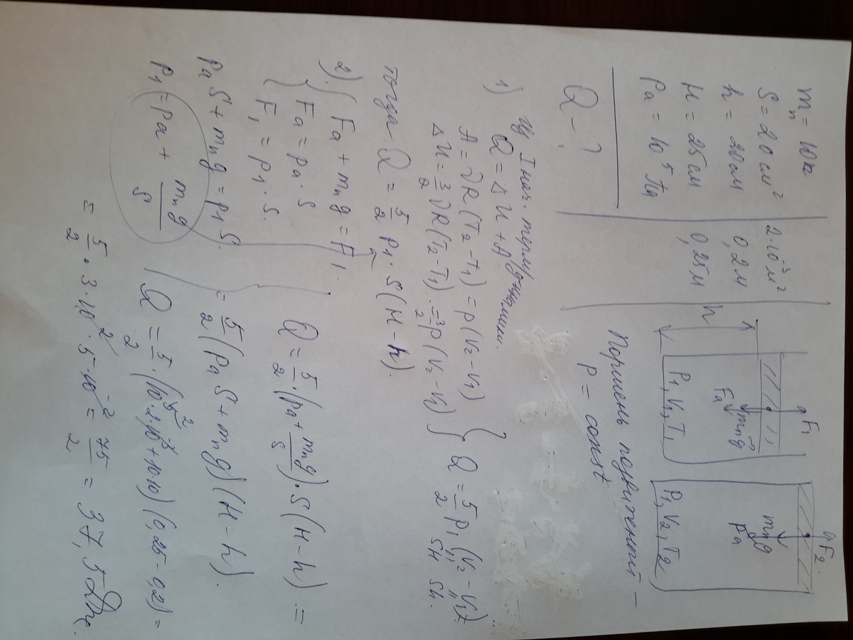 В вертикальном цилиндрическом сосуде под поршнем массой m=10 кг и площадью сечения S=20 (см в квадрате) находится идеальный одноатомный газ. Первоначально поршень находился на высоте h=20 см, а после нагревания газа поднялся на высоту H=25 см. Какое количество теплоты сообщили газу в процессе нагревания? Атмосферное давление 10 в пятой степени Па. Ответ: 37,5 Дж