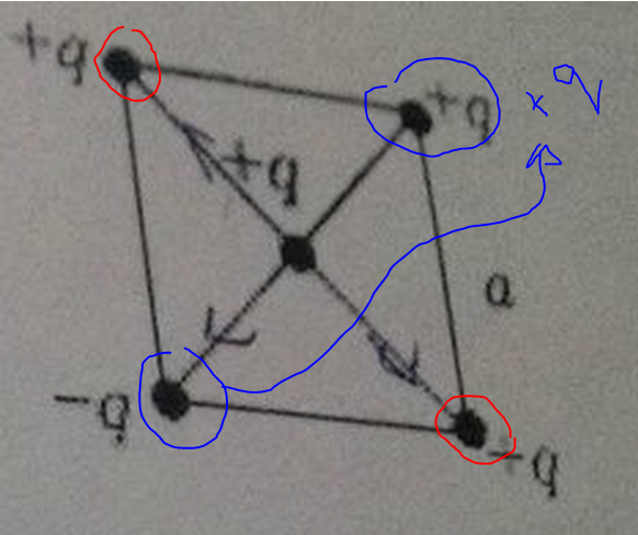 Далее, из соображений симметрии, заряд "- q" можно заменить на заряд с противоположным знаком, переместив его при этом (см. обведенное синим), как показано во вложении. Таким образом мы получим два взаимодействующих заряда: "+q" в центре квадрата и "+2q" - в правом верхнем углу квадрата.