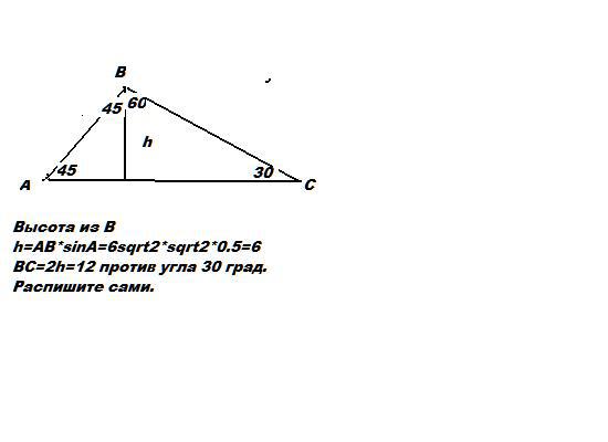 В треугольнике АВС угол А=45 градусов, угол В=105 градусов, АВ=6 корней из 2, найти ВС.