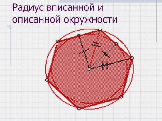 Радиус описанной окружности правильного многоугольникаПравильный многоугольник - это такой многоугольник, у которого равные стороны и углы. А угол между соседними вершинами правильного n-угольника равен:BOA = x = 360°/n, где BOA - треугольник, x - длина его основания, n - это число сторон правильного многоугольника.Построим треугольник BOA отдельно. О нём нам известно:он равнобедренный;бедра треугольника BOA - это так же радиусы описанной окружности правильного n-угольника;длина основания «x» треугольника BOA - это сторона исходного правильного многоугольника.угол между радиусами R, который мы прежде вычислили по формуле (**).В первую очередь необходимо опустить высоту на основание и рассмотреть прямоугольный треугольник, который у нас получился. С помощью тригонометрических функций угла (в данном случае острого) получаем:sin(360°/2n) = x/2R, с чего получаем формулу собственно радиуса описанной окружности правильного n-угольника:R = x/(2sin(360°2n)), R - это радиус описанной окружности правильного n-угольника, x - сторона правильного многоугольника и n - это число сторон правильного многоугольника.
