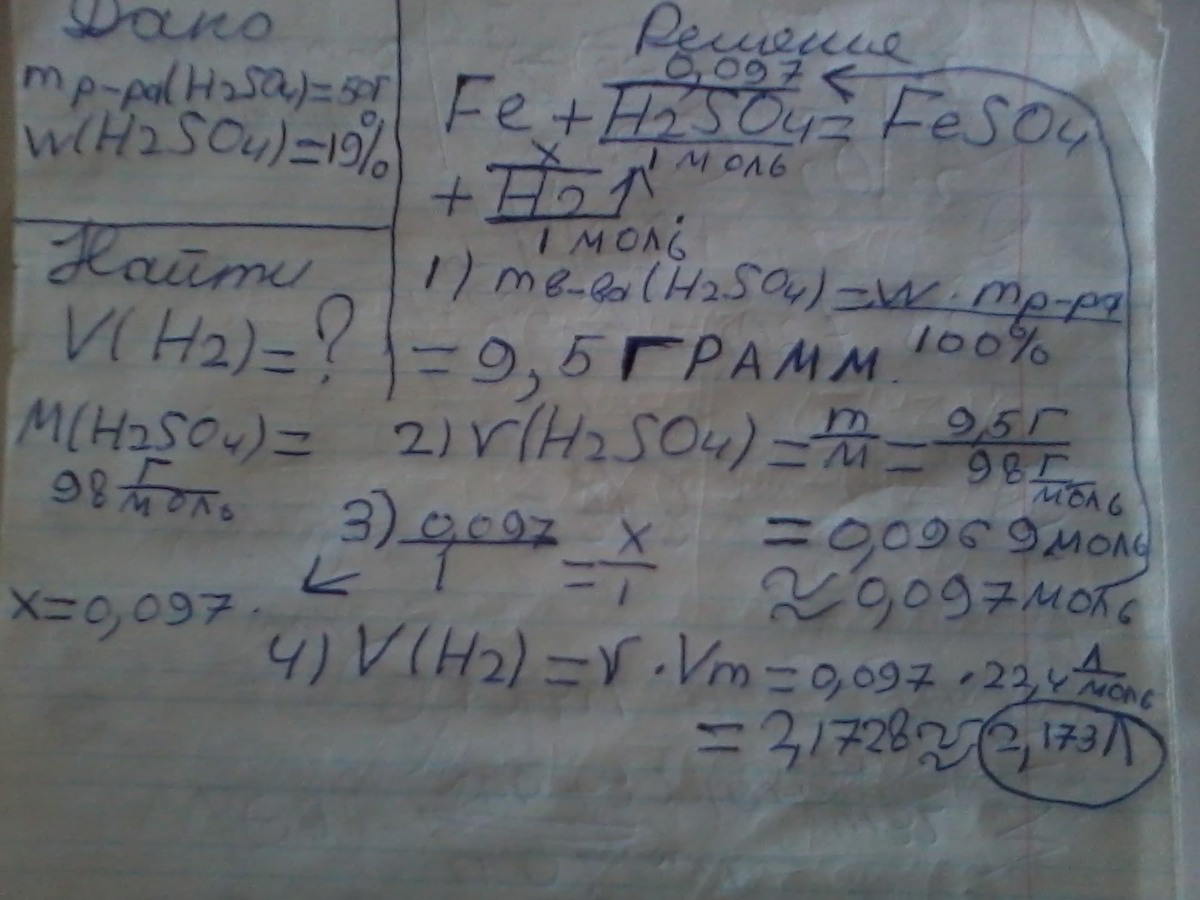определите объем водорода ,который выделится при взаимодействии железных опилок с 50 г 19%-ного раствора серной кислоты