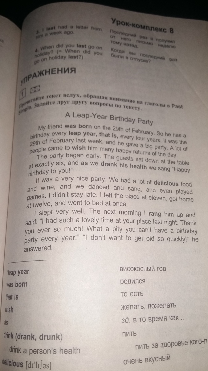 Мой друг родился 29 февраля. Поэтому у него день рождение каждый високосный год, то есть, каждые четыре года. На прошлой неделе было 29 февраля и у он устроил большую вечеринку. Много людей пришло пожелать ему много счастья и чтобы этот день повторялся.