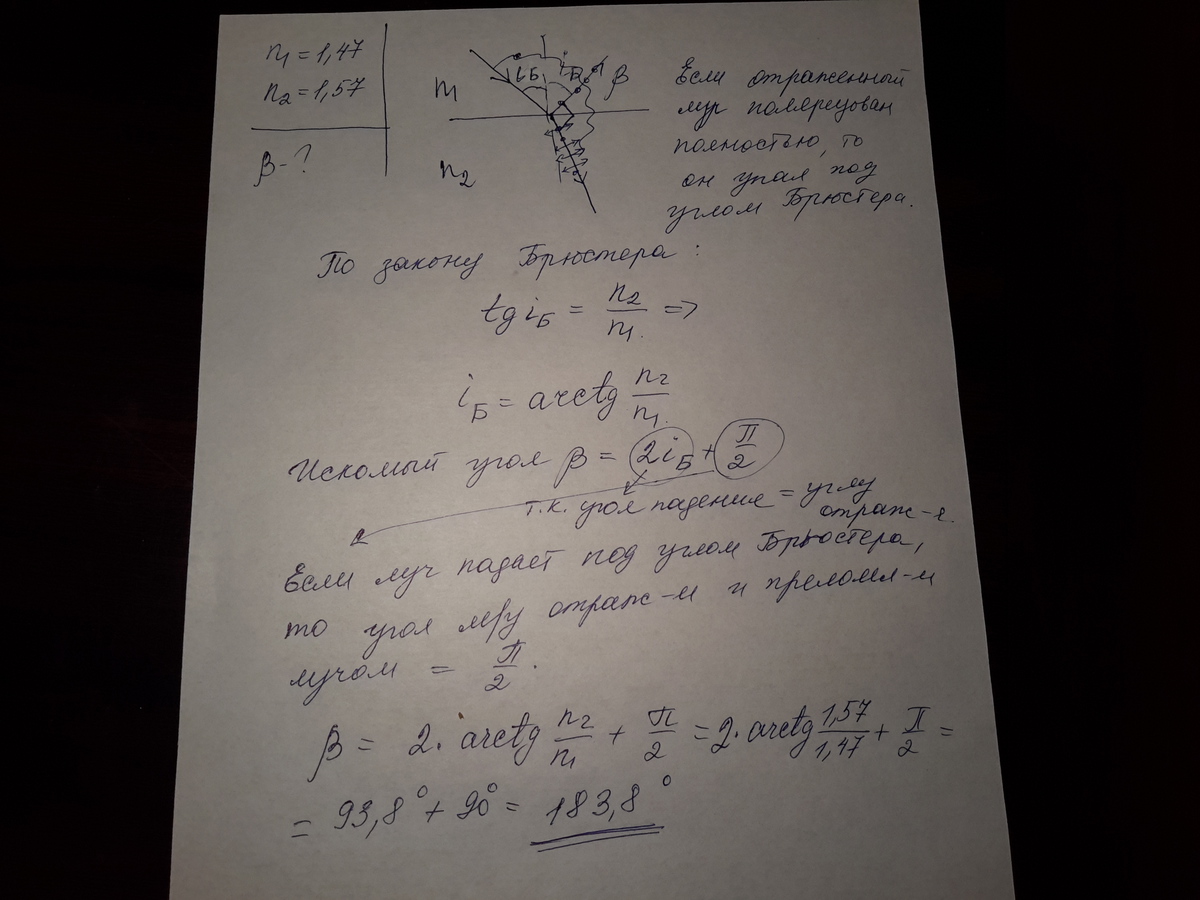 луч переходит из глицерина в стекло так ,что луч, отраженный от границы раздела этих сред оказывать максимально поляризован. определить угол между падающим и преломленным лучами.