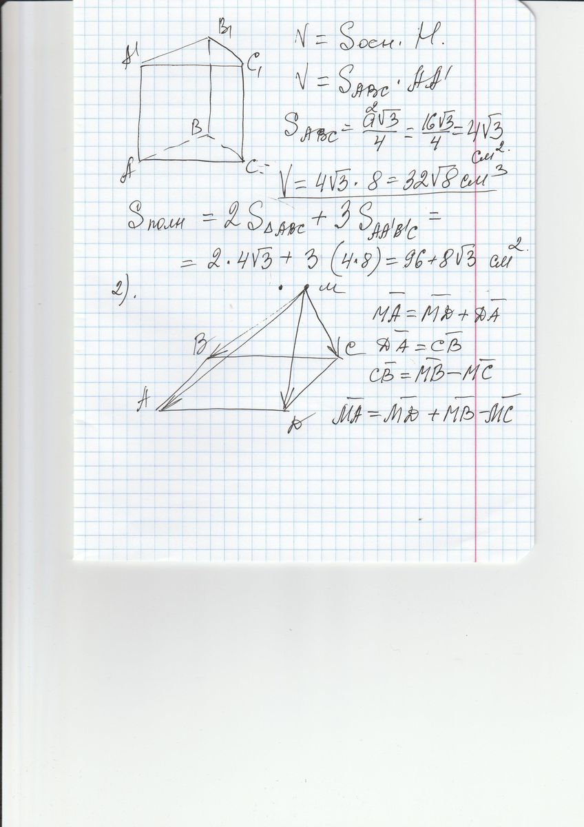 №1. В основании прямой призмы высотой 8 см, лежит равносторонний треугольник со стороной 4 см. Найдите площадь поверхности и объем призмы.