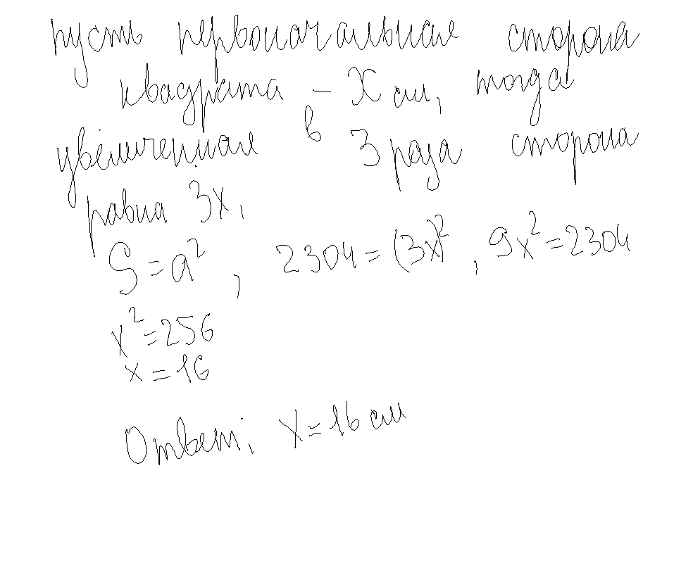 Сторону квадрата увеличили в 3 раза, и получили новый кводрат, площадь которого ровна 2304 см (в квадрате)
