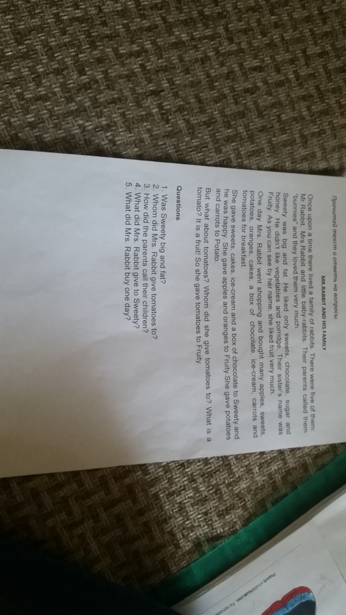 5. One day Mrs Rabbit bought a lot of apples, sweets, potatoes, oranges, cakes, a box of chocolates, ice-cream, carrots and tomatoes.