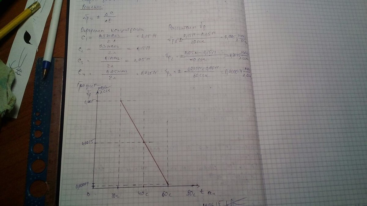 Реакция разложения бромоводорода на простые вещества протекает в сосуде вместимостью 2л. Первоначально в сосуде содержалось 0,5 моль HBr. Через 20 с количество вещества HBr стало равно 0,3 моль, ещё через 40 с - 0,1 моль, а ещё через 1 мин - 0,05 моль. Рассчитайте среднюю скорость реакции на трех временных этапах и постройте график, показывающий зависимость скорости реакции от времени.