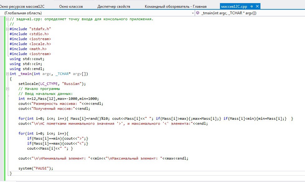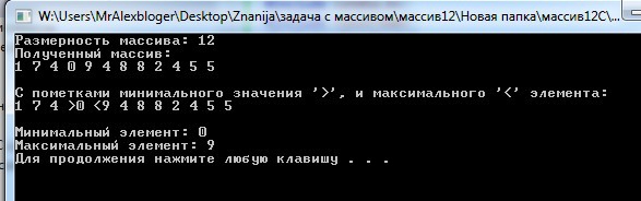 Язык C++. Сформировать массив из 12 элементов. Вывести его на экран, выделив минимальный и максимальный элементы массива (например, восклицательными знаками).