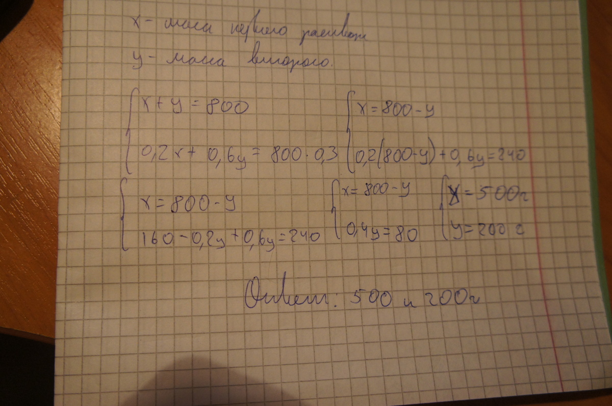смешав 20-процентный и 60-процентный растворы кислоты, получили 800 г раствора, содержащего 30% кислоты. Сколько граммов каждого раствора смешали? Помооогииите поожалууустааа!!!