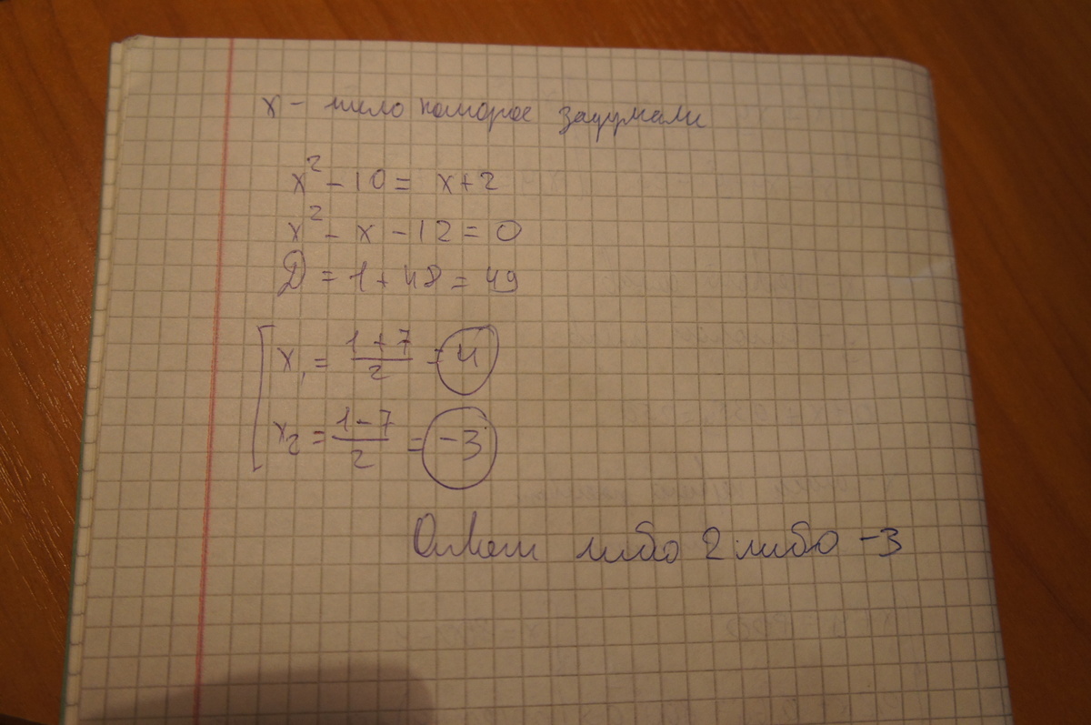 Из квадрата задуманного числа вычли 10 и получили число, на 2 больше задуманного. Какое число было задумано?
