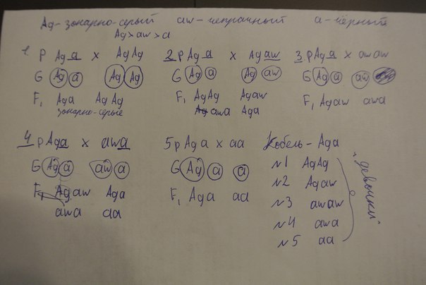 В этой задаче следует начать с конца. Так как ген чёрной окраски полностью рецессивен, в последнем скрещивании должно стать понятно, есть ли в генотипе кобеля ген aw. Так как от чёрной девочки не родилось ни одного чепрачного щенка, мы понимаем, что вторая буква, которой не хватает для полного описания генотипа кобеля по этому признаку, это "а" - полностью рецессивный ген. Остальное - дело техники.