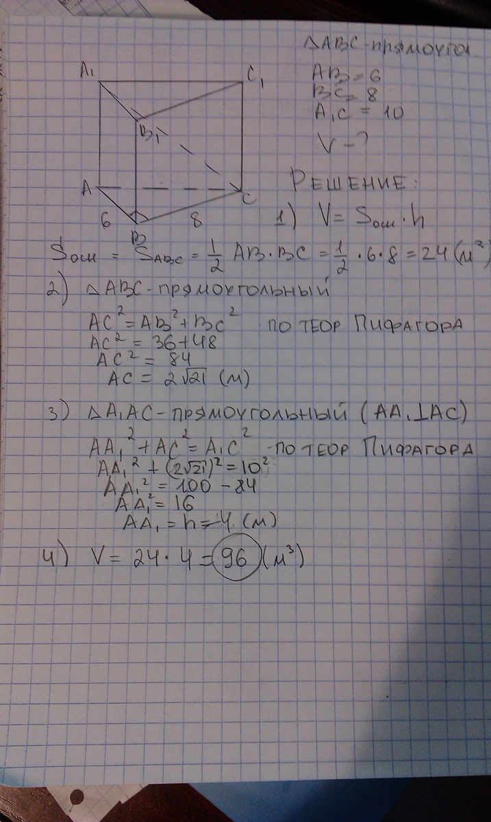 2. Основание прямой призмы – прямоугольный треугольник с катетами, равными 6 м и 8 м, а диагональ большей по площади боковой грани равна 10 м. Найти объем призмы.