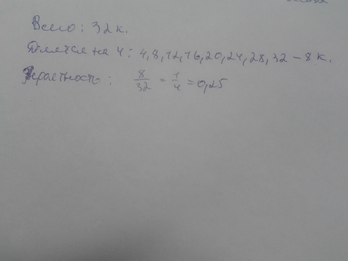 У шухляді лежать 32 картки, які пронумеровано числами від 1 до 32. Яка ймовірність того, що номер навмання взятої картки буде кратним числу 4?
