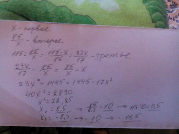 найти три числа из которых второе больше первого на столько насколько насколько третье больше второго если известно что произведение двух меньших чисел равно 85 а произведение двух больших равно 115