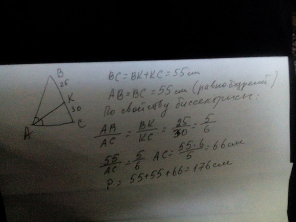 бисектриса проведена к боковой стороне равнобедренного треугольника и делит его на отрезки 25 и 30, начиная с вершины противоположной основе, найти периметр.