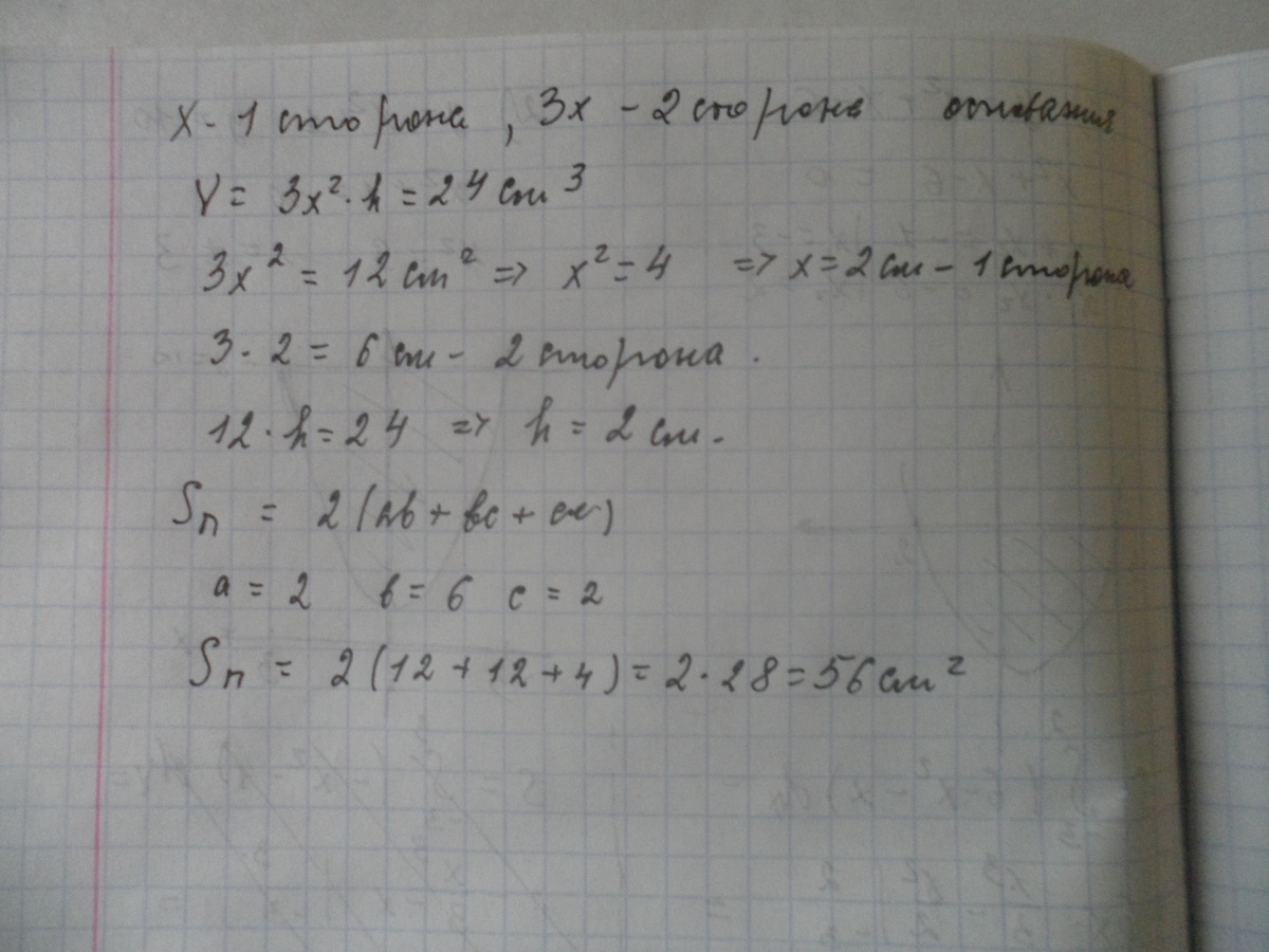 объем прямоугольного параллелипипеда 24 см^3, площадь основания 12. одна сторона основания в 3раза больше другой. вычислите полную площадь поверхности параллелипипеда