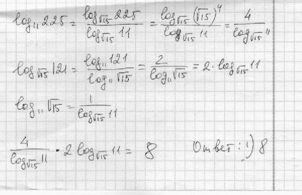 ... = log(11)(15²) * (2 / log(11)(√15) = 2*2*log(11)(15) / (0.5*log(11)(15)) = 8