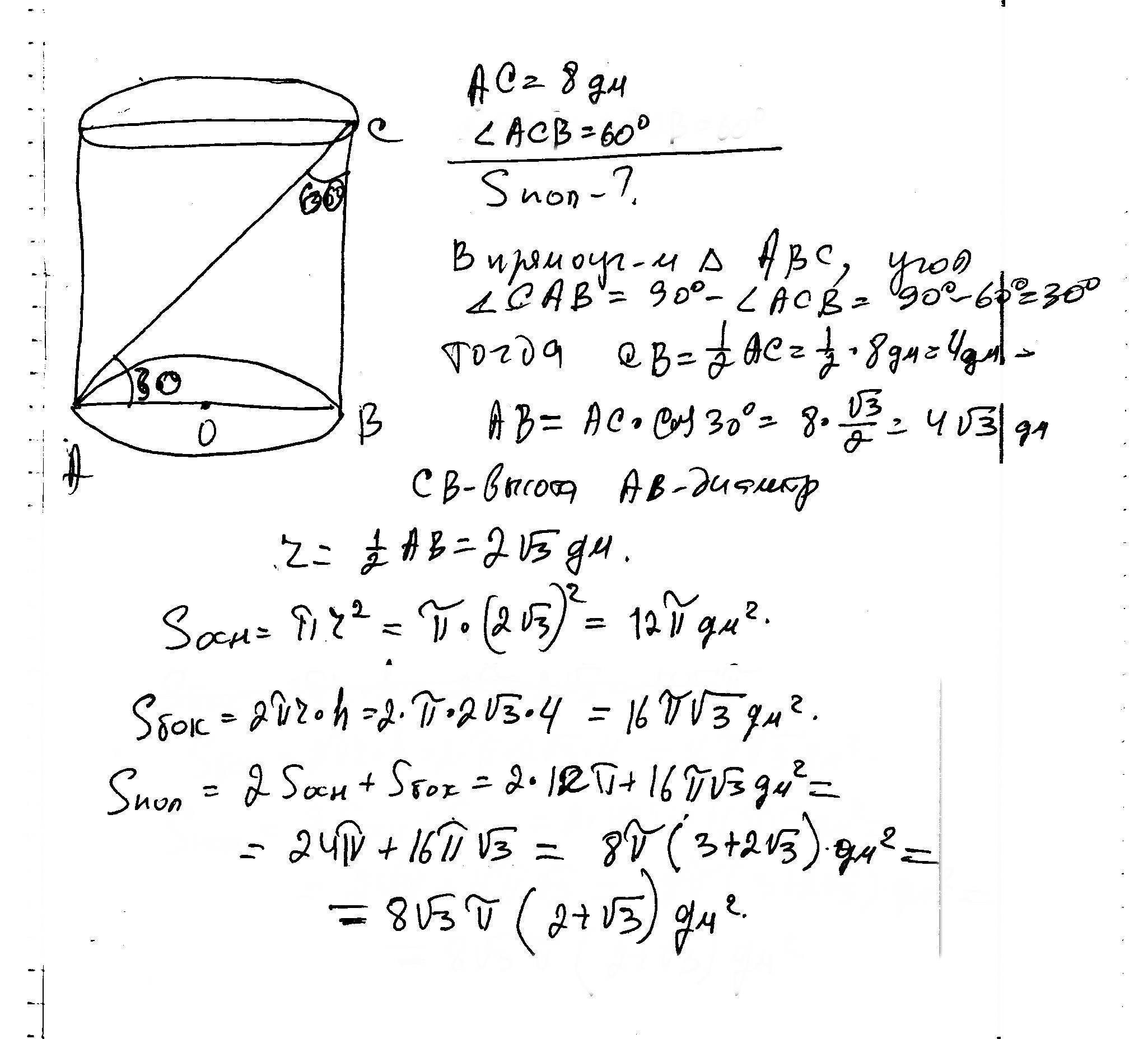 Помогите решить задачу по геометрии с рисунком!!!Диагональ осевого сечения цилиндра равна 8 дм и составляет с образующей угол 60 градусов. Найдите площадь полной поверхности цилиндра.
