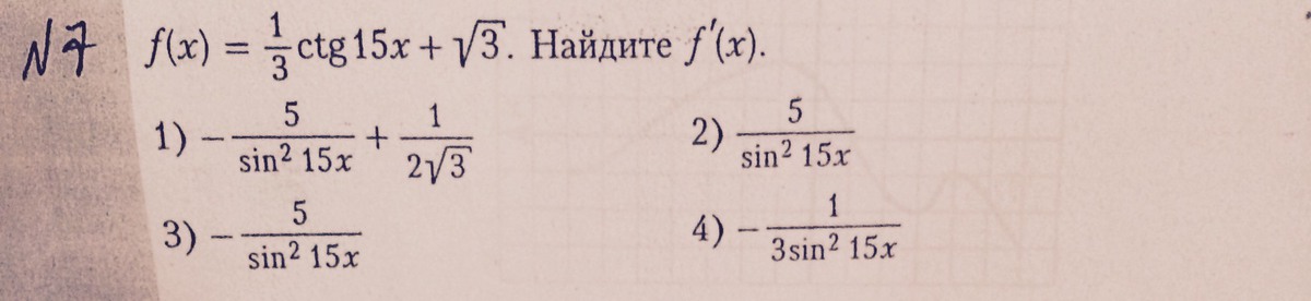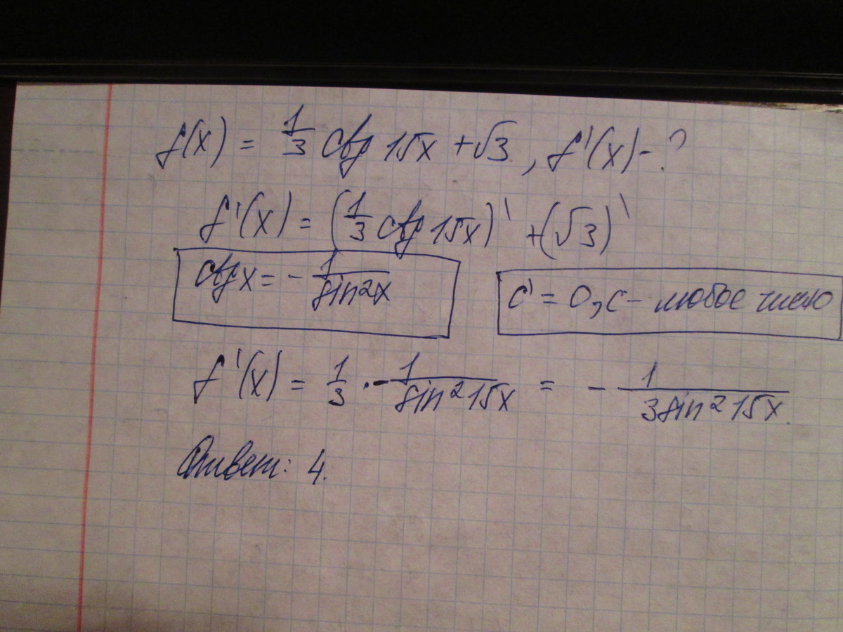 В рамках обозначены формулы производной от катангенса и числа, производная любого числа = 0, поэтому рассчитываем только левую часть, умножаем производную катангенса на 1/3, получаем отрицательную дробь, правильный ответ в четвертом пункте.
