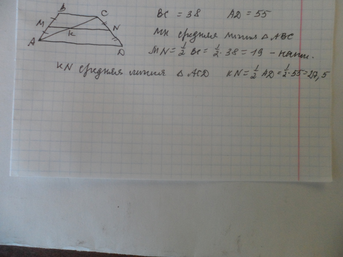 основание трапеции равны 55 и 38 . найдите меньший из отрезков , на которые делит среднюю линию этой трапеции одна из её диагоналей.