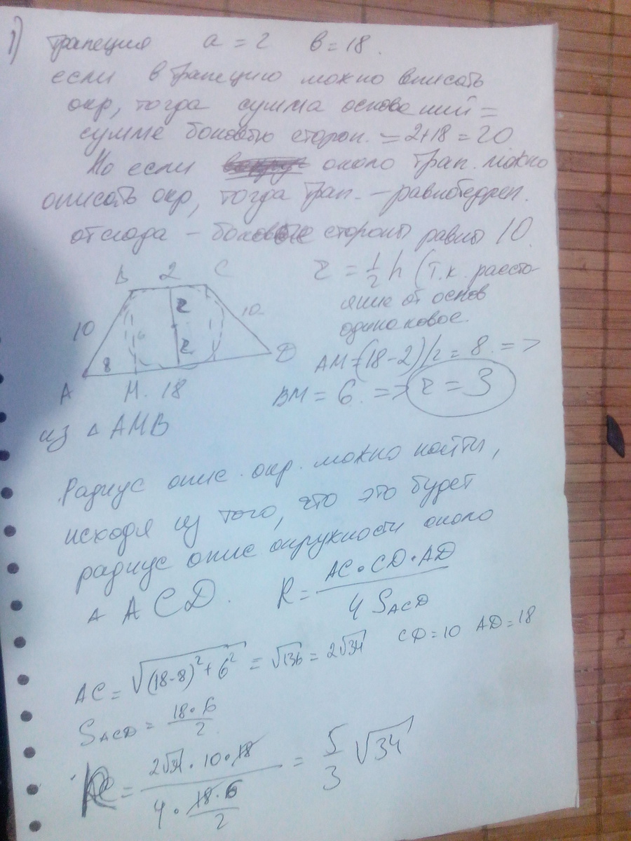 Известно, что около трапеции можно описать окружность и можно вписать окружность. Найдите радиусы окружностей, описанной около трапеции и вписанной в неё, если основания трапеции равны 2см, 18см.