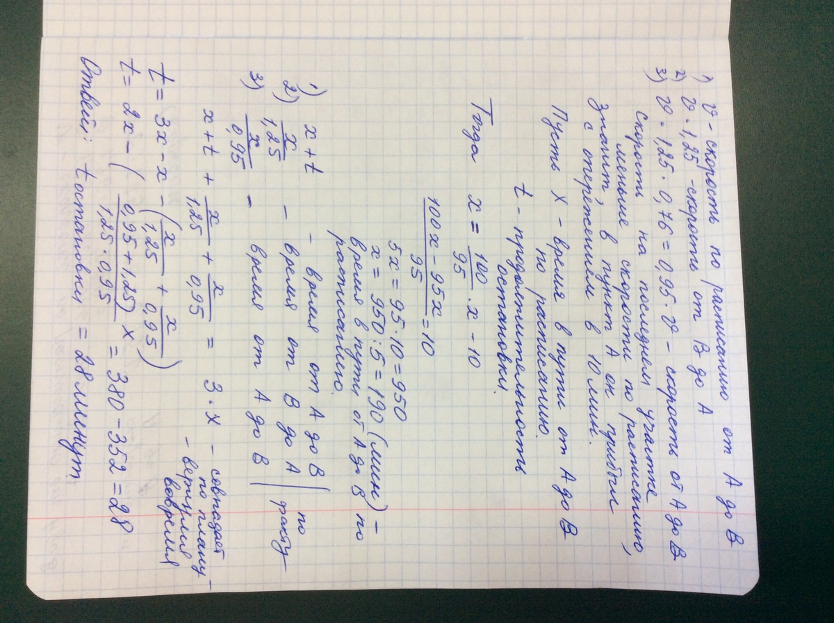 ПЛИЗ ПОМОГИТЕ СРОЧНО. Согласно расписанию, автобус курсирует по маршруту из пункта A в пункт B и обратно с постоянной скоростью и без остановок. На пути из A в B он был вынужден на некоторое время остановиться, поэтому на обратном пути увеличил скорость на 25%. Приехав в A с 10 минутным отклонением от расписания, он уменьшил свою последнюю скорость на 24% и прибыл в B вовремя. Сколько минут длилась вынужденная остановка