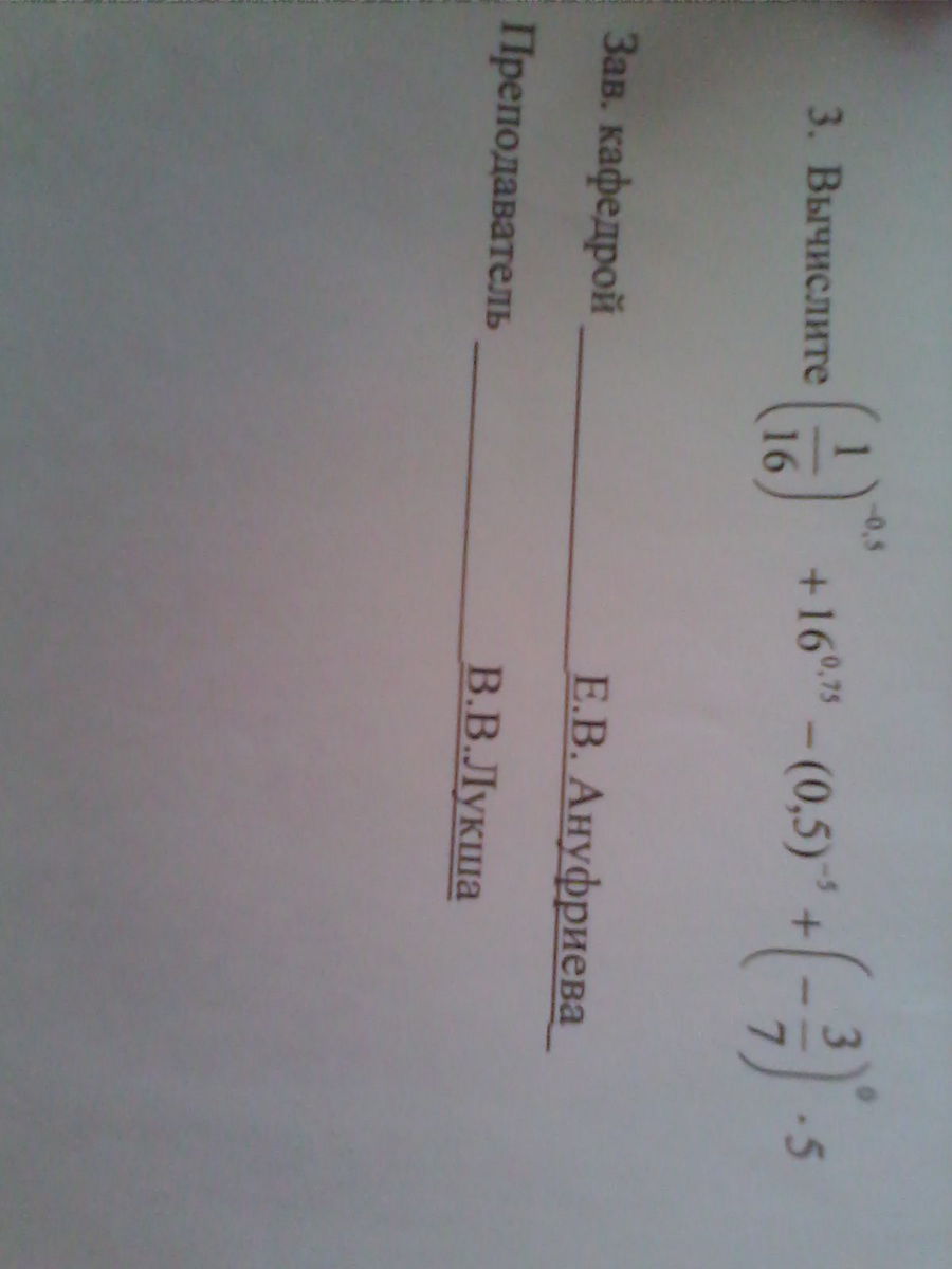 ( \frac{1}{16} )^{-0,5} + 16^{0,75} - (0,5)^{-5} +  (-\frac{3}{7} )^{0} *5= 16^{ \frac{1}{2} } + 16^{ \frac{3}{4} } - ( \frac{1}{2} )^{-5} -5=4+ \sqrt[4]{ 16^{3} } - 2^{5} -5=4+ \sqrt[4]{4096} -32-5=4+8-32-5=-25