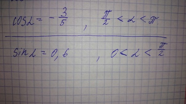 Заметим, что α принадлежит второй четверти. Синус во второй четверти положителен, значит: sinα = 4/5