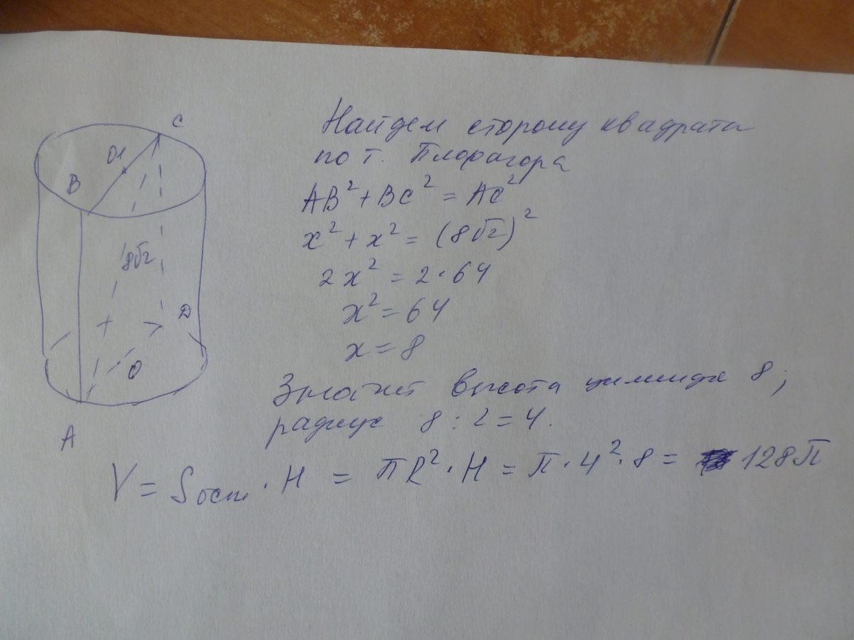 Помогите решить задачу с рисунком!!!Осевым сечением цилиндра является квадрат диагональ которого равна 8корней из 2. Найдите объем цилиндра