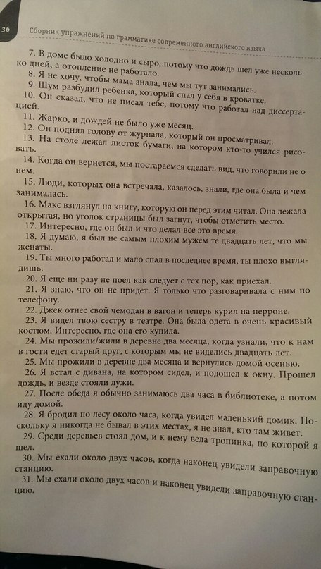 7. The house was cold and wet, because the rain was already MULTI to days, and the heating was not working 8. I do not want my mother to know what we're doing 9. The noise woke the baby, who was sleeping in his crib. 10. He said that he did not write to you because it worked on 11 tion's dissertation hot, and there was no rain for a month 12. He looked up from the magazine he was looking through 13. On the table lay a piece of paper on which someone Rizo studied Vatb 14. When he comes back, we will try to make it appear that not talking about eM 15. The people she met seemed to know where she was and what to do 16. Max glanced at the book he was reading before that. She was open, but was bent page corner to mark the place of 17. Interestingly, de he was and what he did all that time l 8. I guess I was not the bad husband those twenty years, we married 19 hours you've worked hard enough slept in the last vyglya time, you're not di lll b 20. I have never eaten properly stoich since come 21. I know that he will not come. I just razrovarivala with him on the phone 22. Jack carried his suitcase into the car and now smoking on the platform 23. I saw your sister in the theater. She was dressed in a very nice suit. I wonder where she bought it 24. We lived lived in the village for two months when we learned that our guest rides an old friend, with whom we had not seen for twenty years 25. We lived in the village for two months and returned home in the fall 26. I I got up from the sofa on which he sat, and walked to the window. It has been rain, and everywhere there were puddles of 27. After dinner, I usually takes two hours in the library and then go home 28. I wandered through the woods for about an hour when I saw a little Since the I have never been in this house. places I did not know who lives there 29 was a house among the trees, and it led to the path on which I was 30. We are there for about two hours, when I finally saw petrol